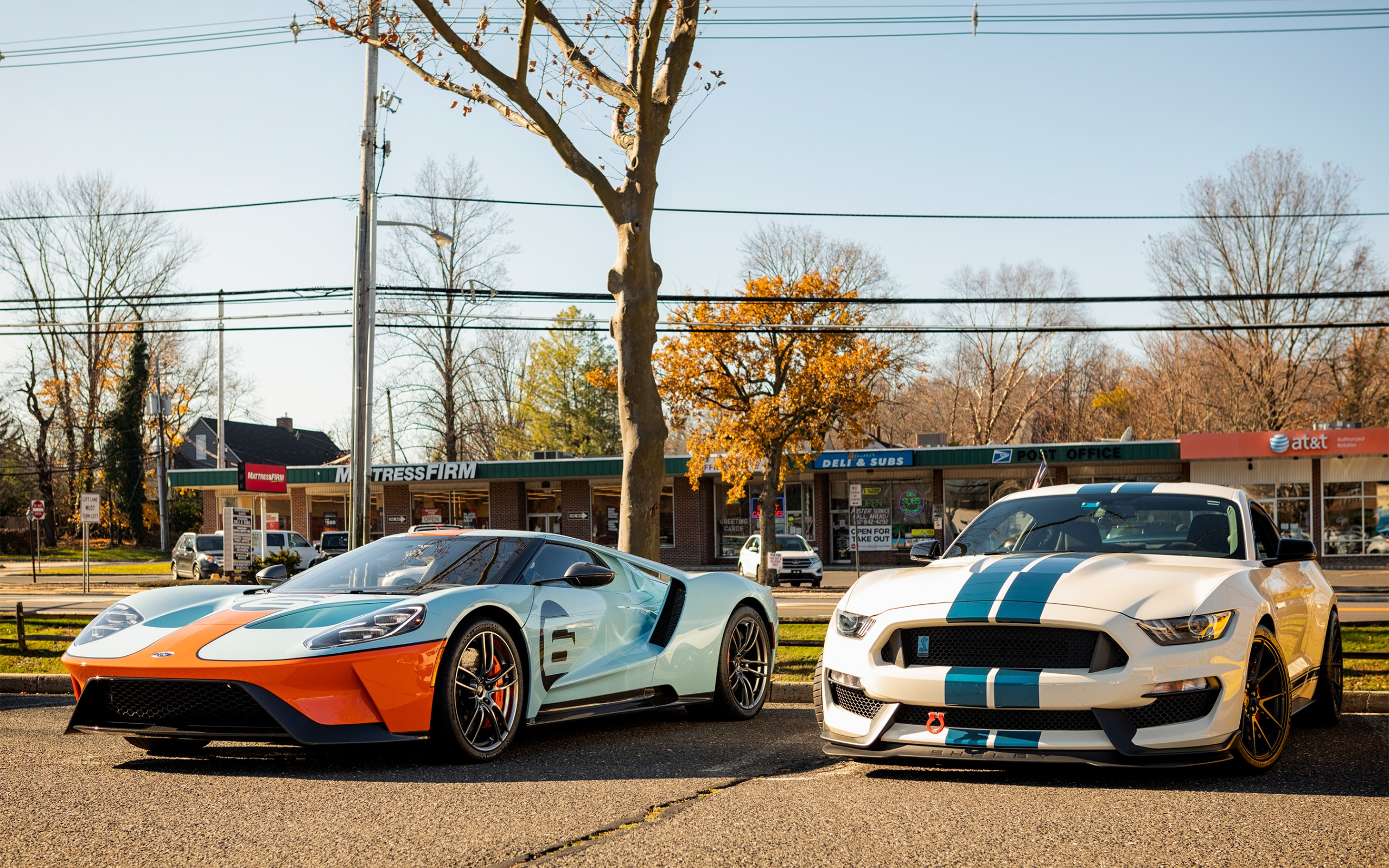 Description: Two cars parked next to each other on a street near a gas station and a gas station with a gas station.