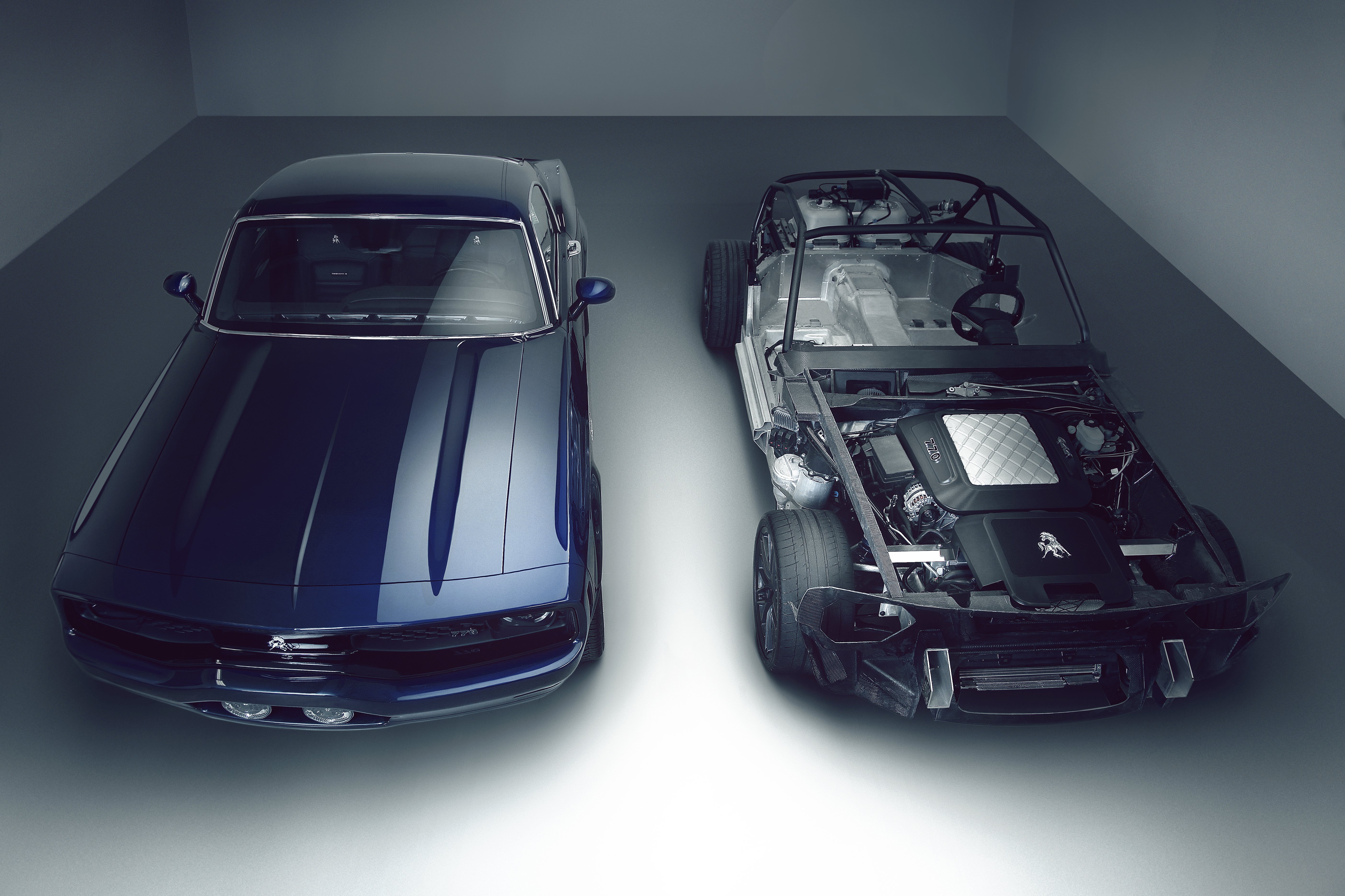 Description: Two cars with a hood open in a room with a light on the floor and a white wall behind them.