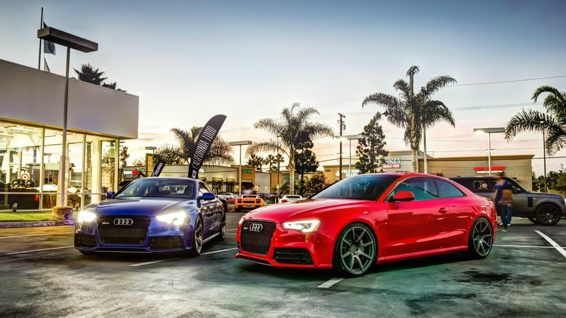 Description: Two cars parked in a parking lot next to each other in front of a building with palm trees and a parking lot.