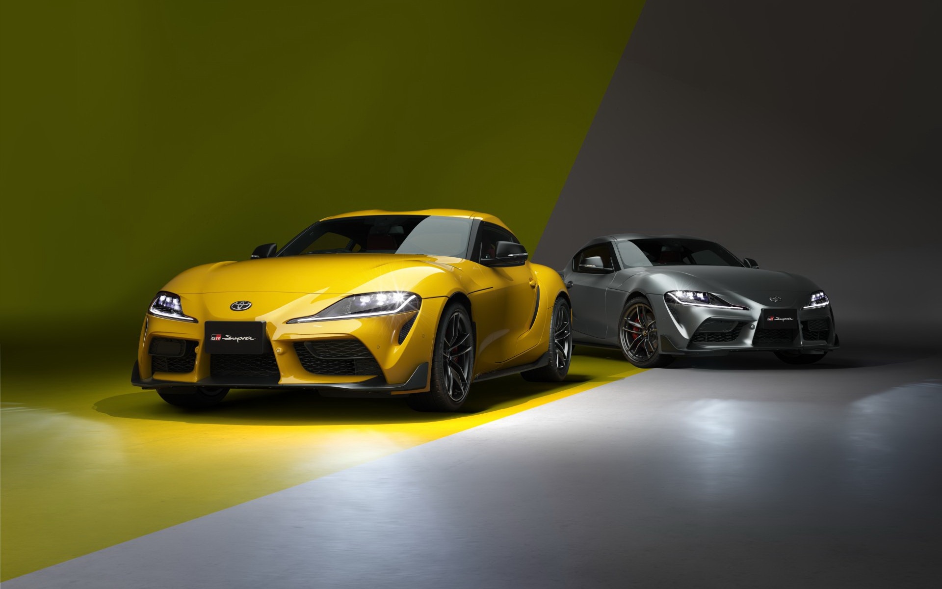 Description: Two cars are shown side by side in a studio setting with a green and yellow background and a black and white one.