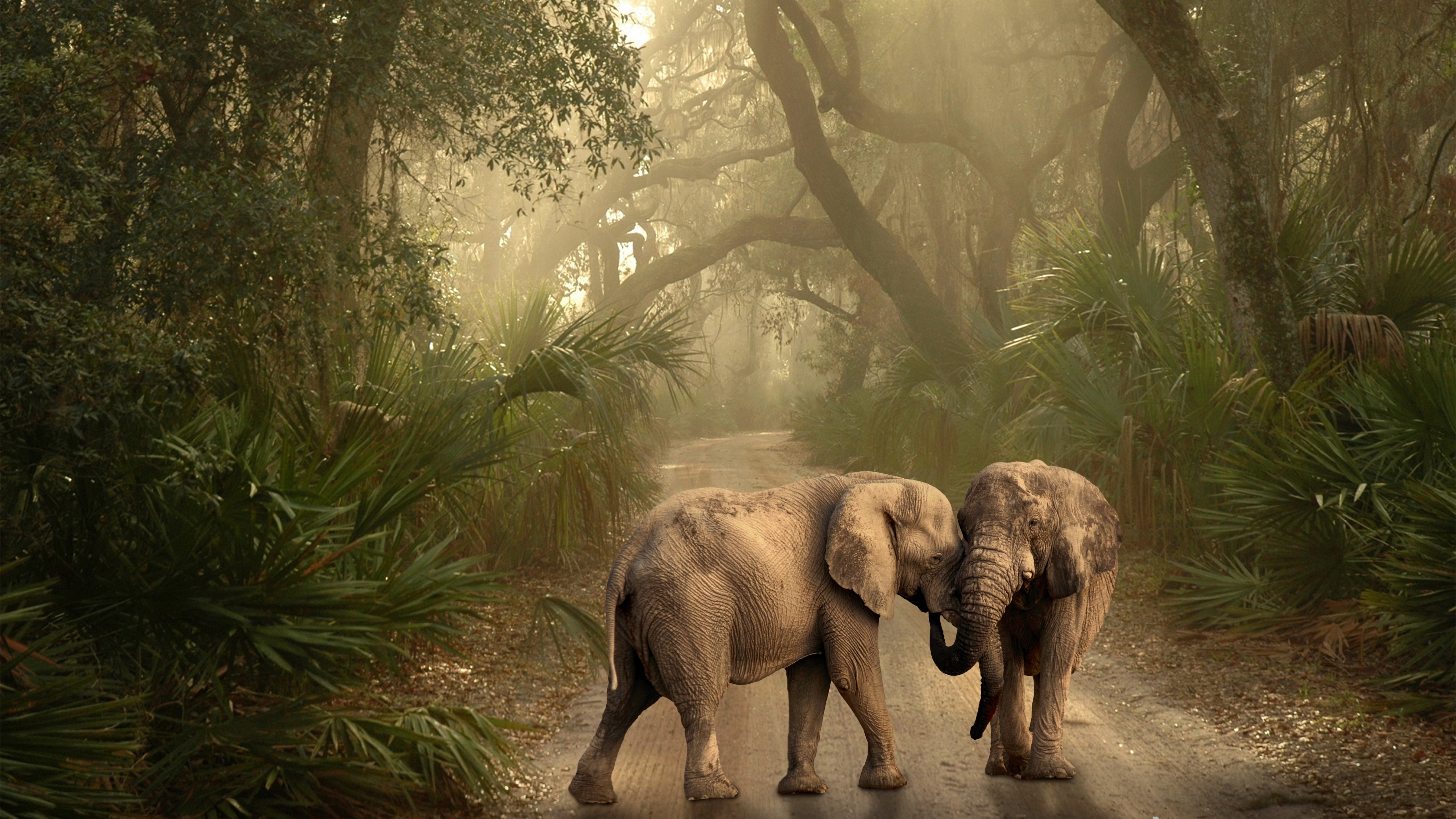 Description: Two elephants walking down a dirt road in the woods with trees and bushes behind them and foggy skies above.