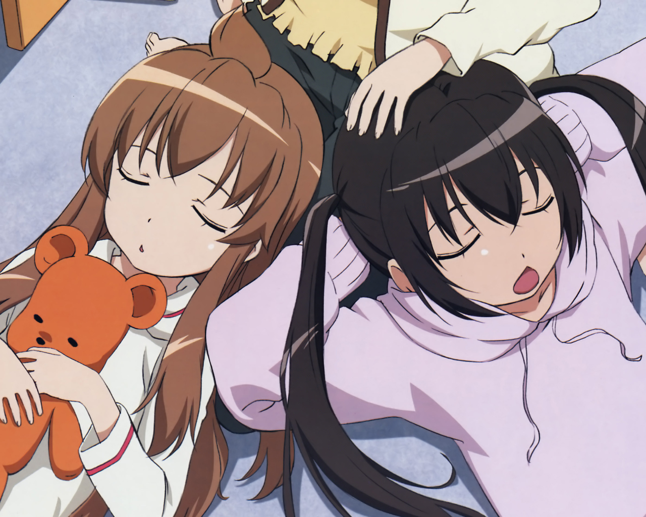 Description: Two girls laying on a bed with a teddy bear in their hands and a teddy bear in their other hand.