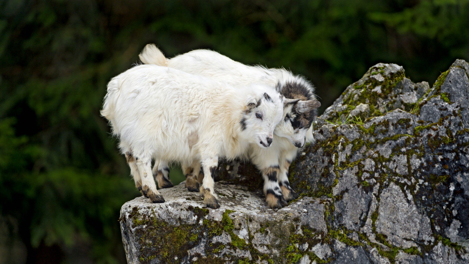 Description: Two goats standing on a rock in the woods near a forest area with trees in the background and a green area in the foreground.