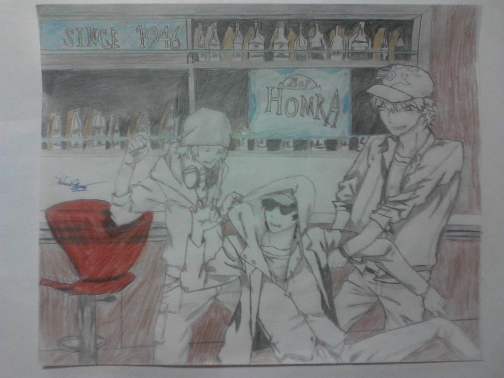 Description: A drawing of two men sitting at a bar with a red chair in front of them and a sign that says.