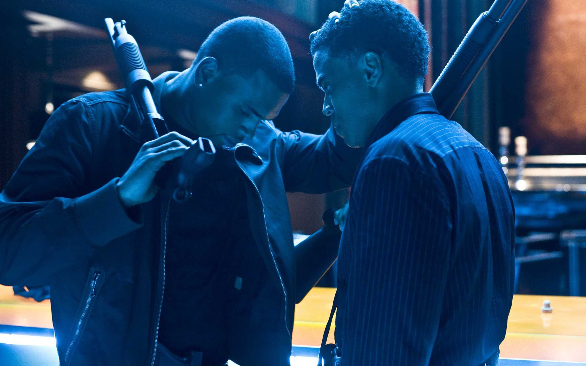 Description: Two men standing next to each other holding baseball bats and looking at their cell phones in a darkened room.