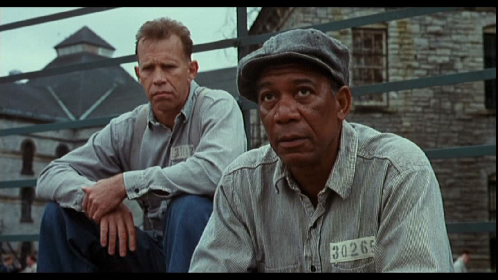 Description: Two men sitting on a bench in front of a building with a gate and a gate behind them.