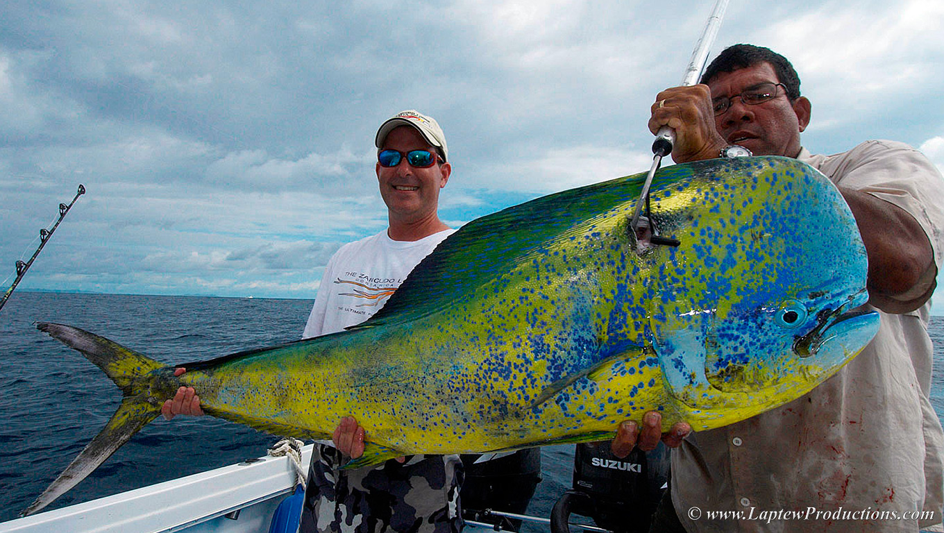 Description: Two men holding a big fish on a boat in the ocean with cloudy skies in the background and a blue sky.
