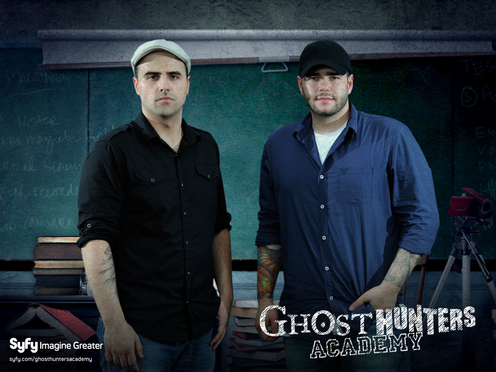 Description: Two men standing next to each other in front of a blackboard with writing on it and a camera.