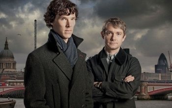 Description: Two men standing next to each other in front of a city skyline with a bridge in the background and a cloudy sky.