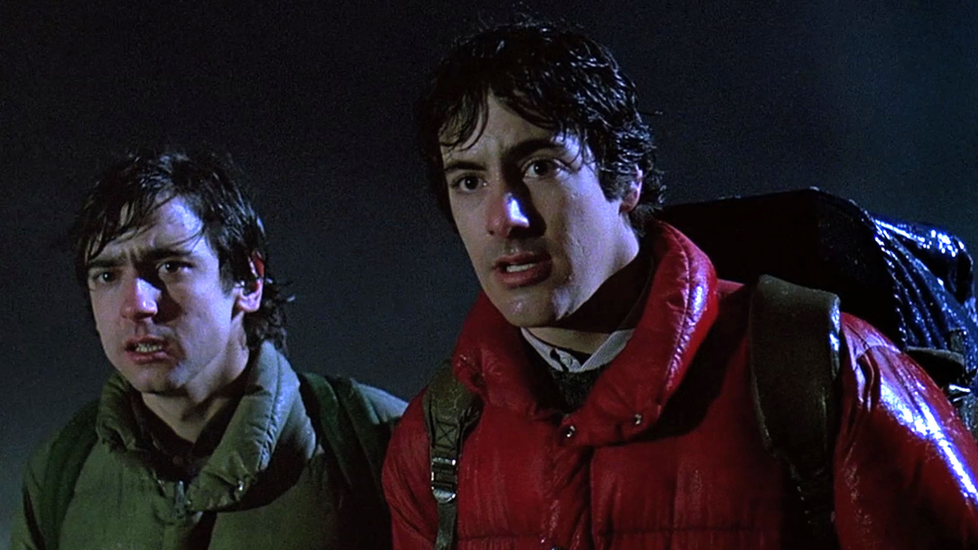 Description: Two men standing next to each other in the dark with a backpack on their back and one man in the middle of the photo.