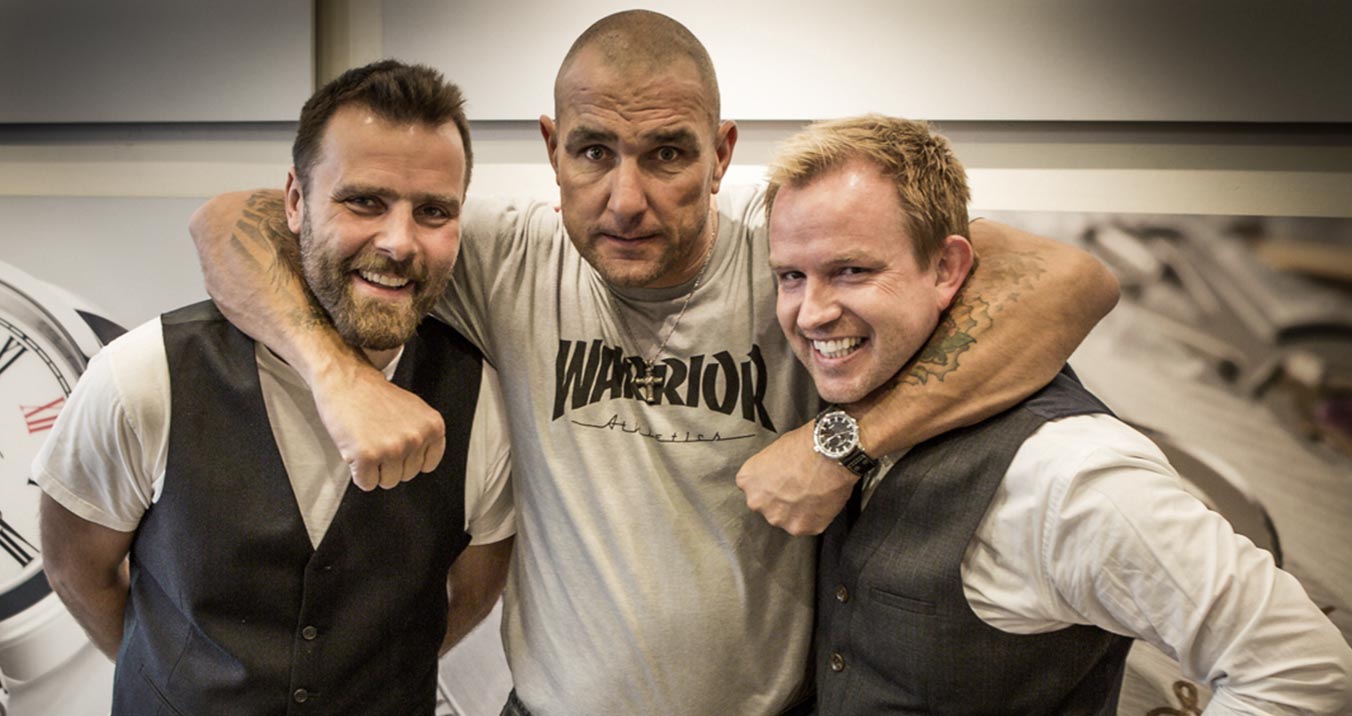 Description: Two men are hugging while standing next to each other in front of a clock tower with a bald man on his back.