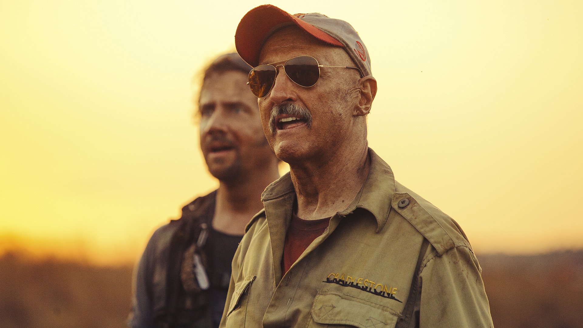 Description: Two men standing next to each other in a field at sunset or sunrise time.