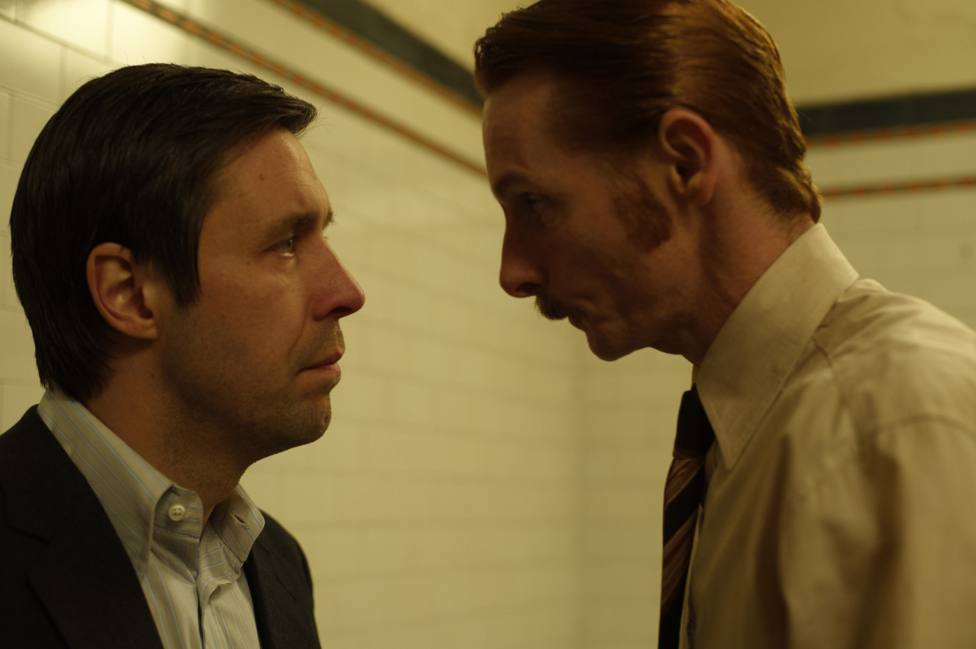 Description: Two men standing next to each other in a room with a wall and a door behind them.
