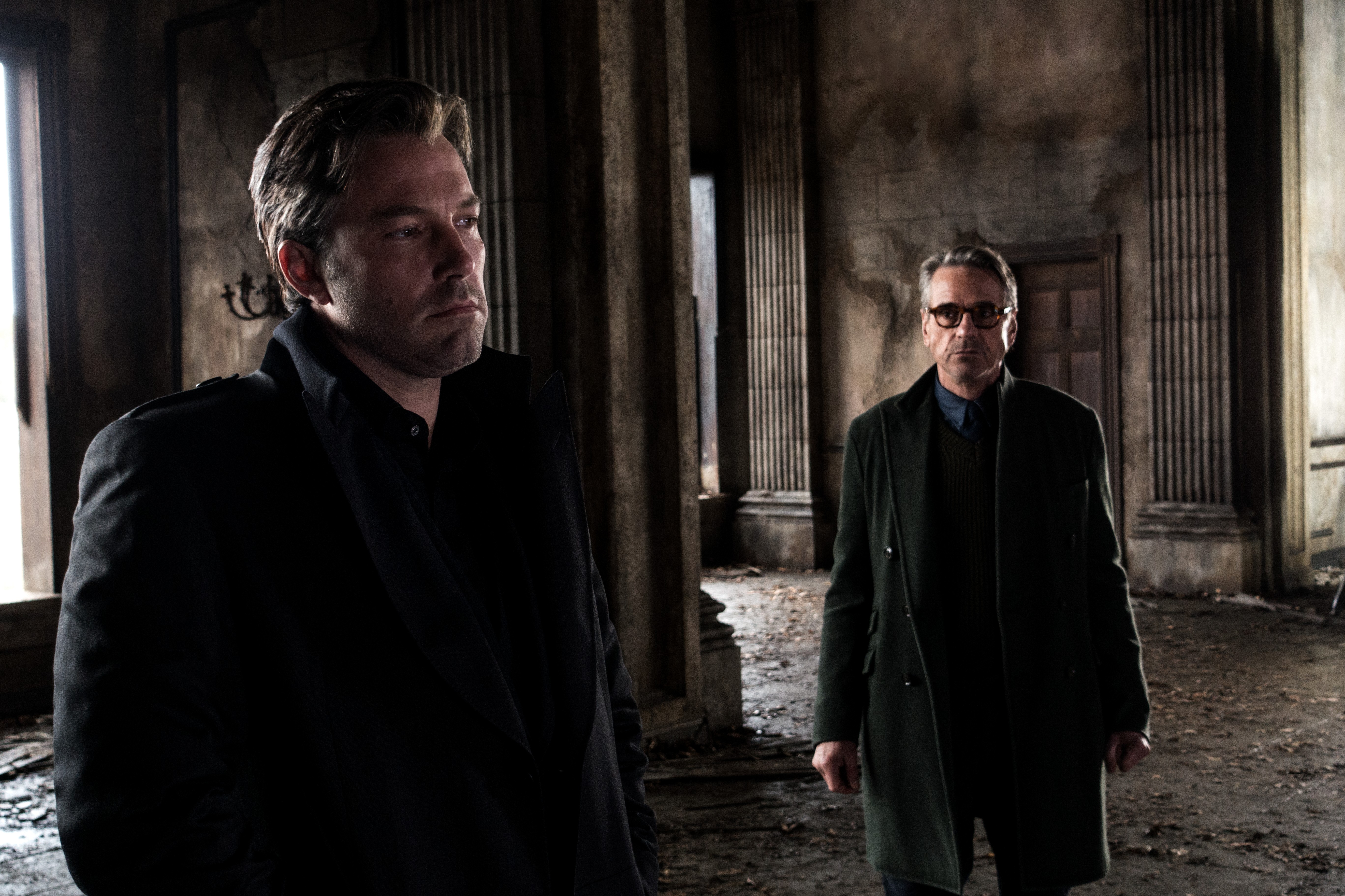 Description: Two men standing in a room with a window in the background and a wall in the background with columns.