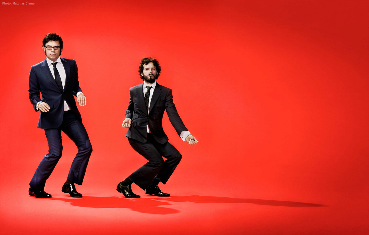 Description: Two men in suits are dancing on a red background with a red backdrop behind them.