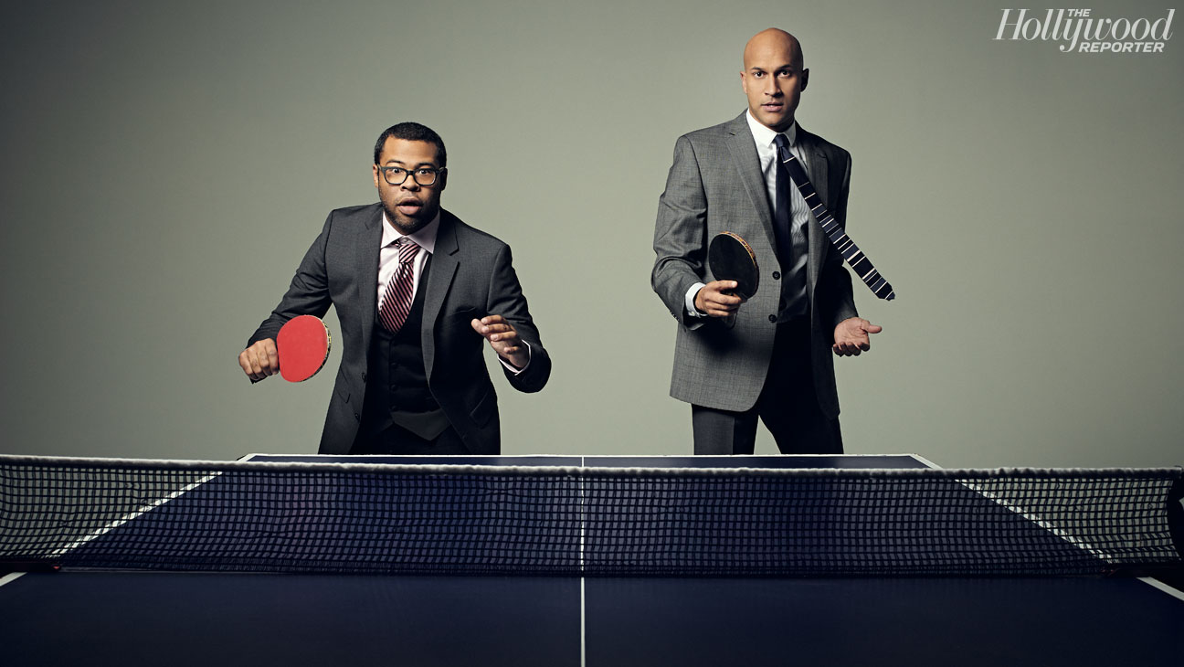 Description: Two men in suits holding ping pong paddles and a ping pong paddle on a ping pong table.