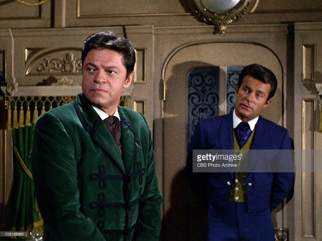 Description: Two men in suits standing in a room with a clock on the wall behind them and a mirror on the wall behind them.