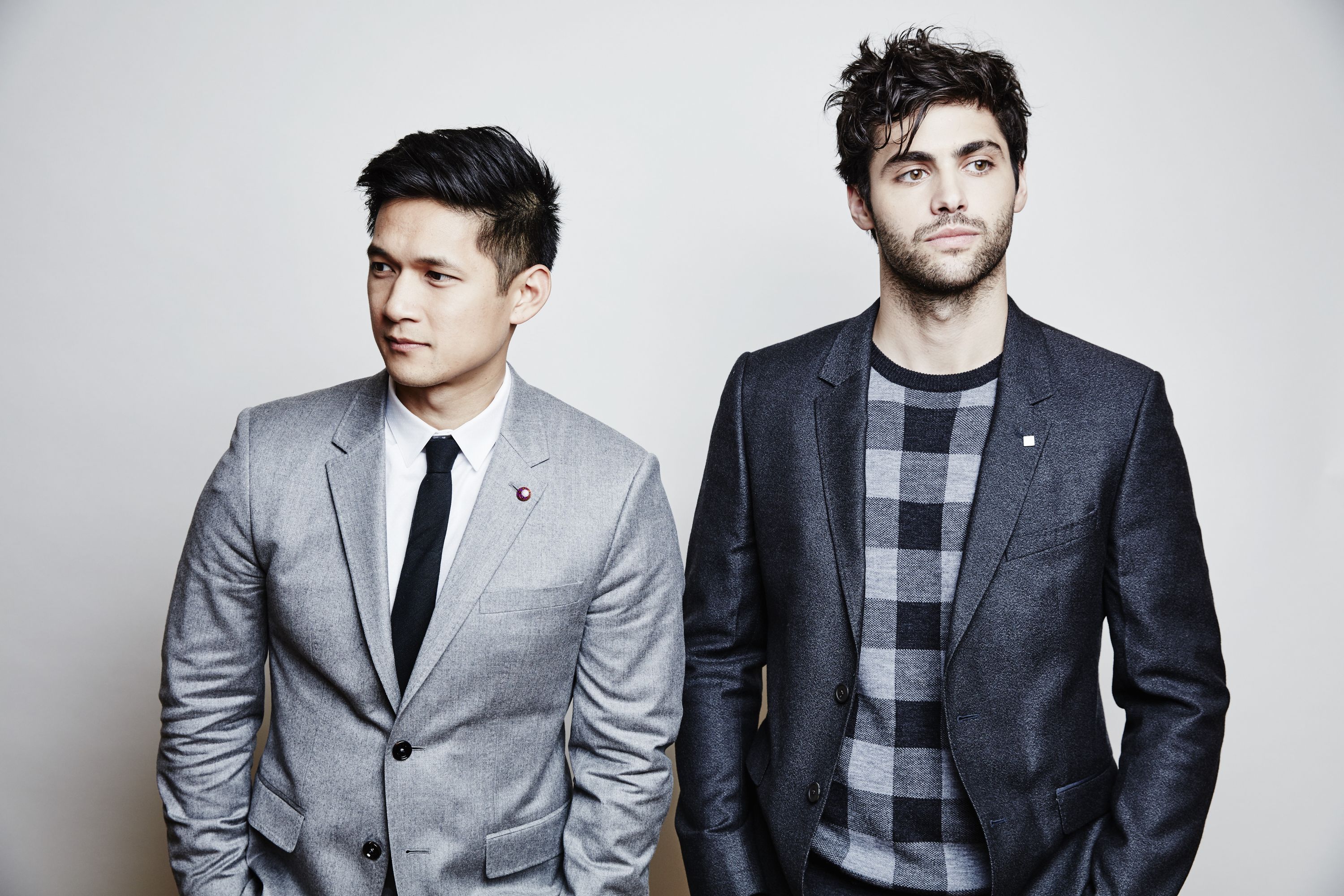 Description: Two men in suits standing next to each other in front of a white wall and one is wearing a black tie.