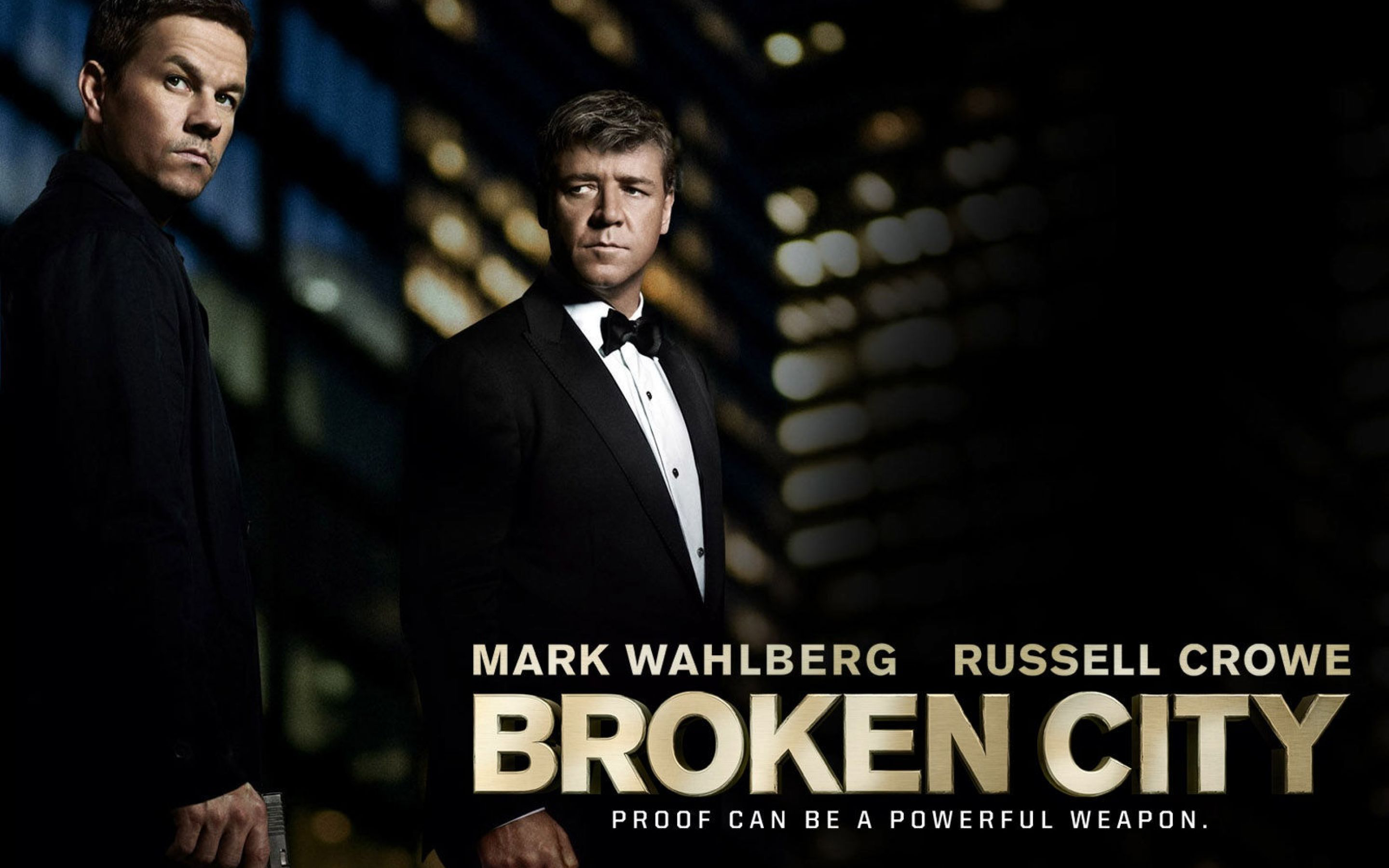 Description: Two men in tuxedos standing in front of a building at night with the words broken city written below.