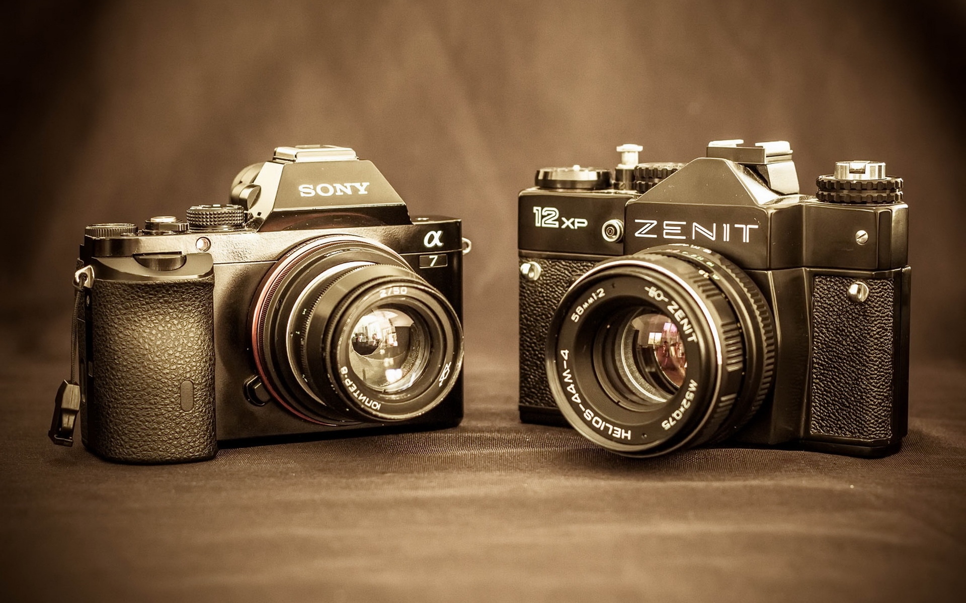 Description: Two old cameras sitting side by side on a table top with a brown background and a black and white photo of the same camera.