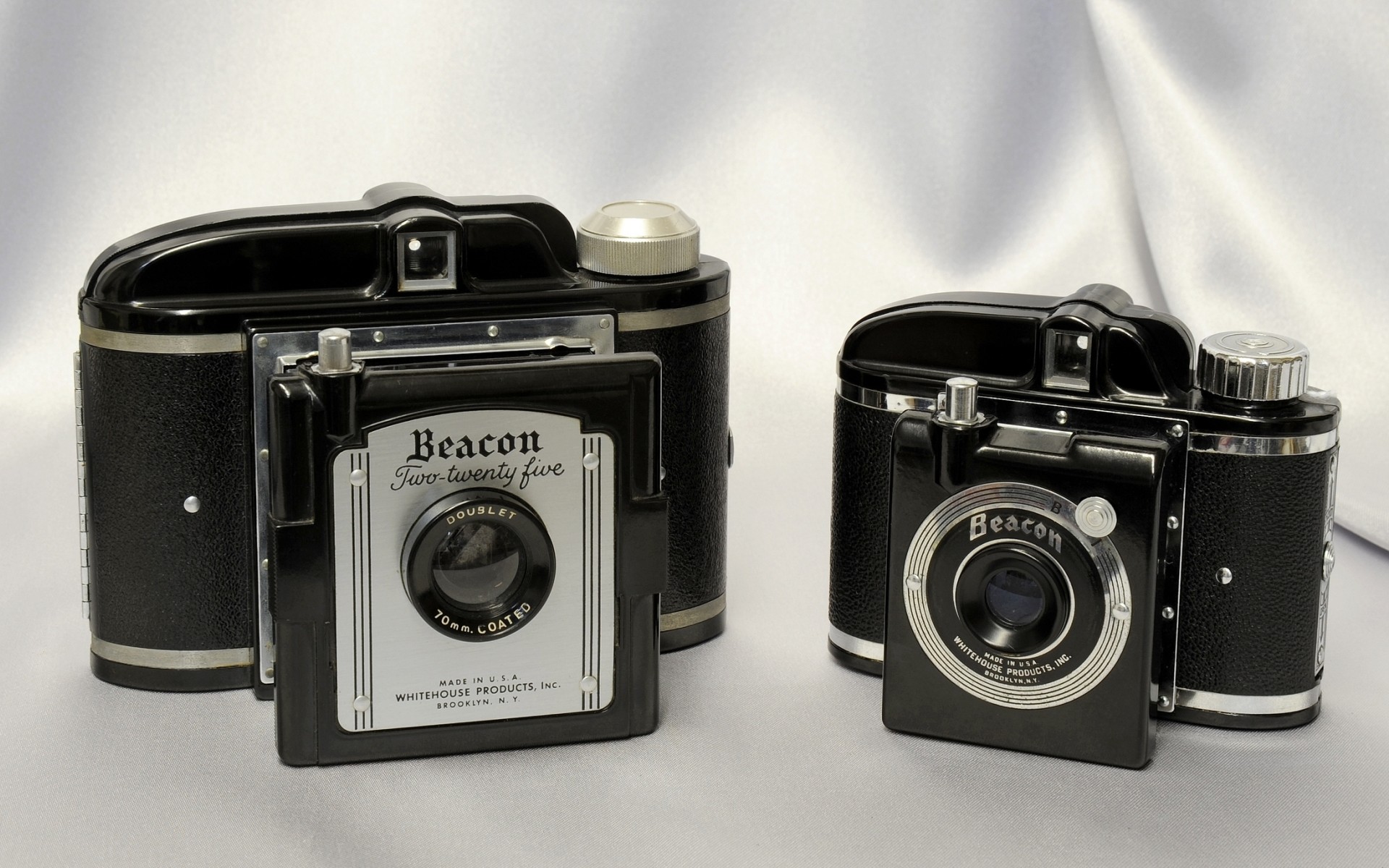 Description: Two old fashioned cameras sitting on a white cloth covered surface.