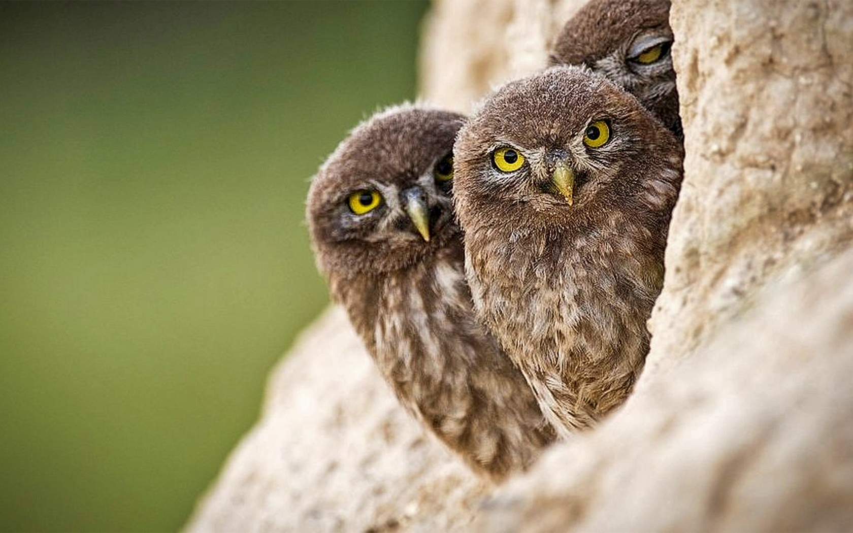Description: Two owls are peeking out of a rock wall together.