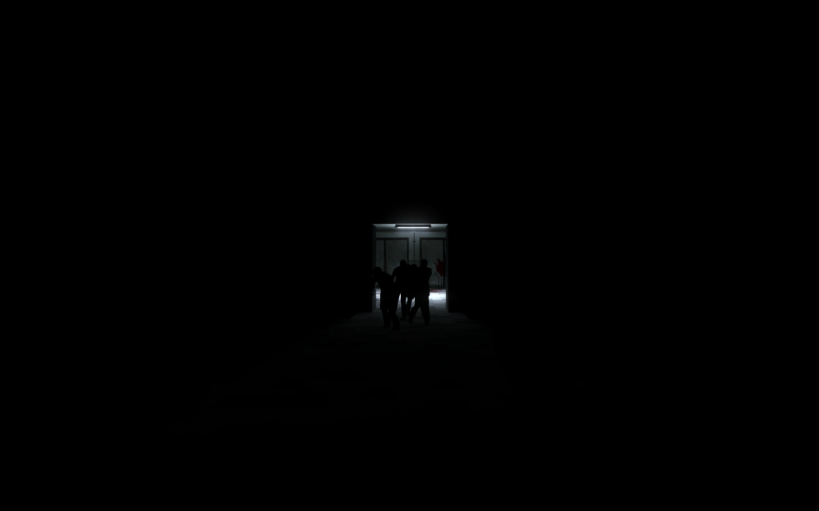 Description: Two people standing in a doorway at night with a light on the door and a dark background with only one person standing in the doorway.