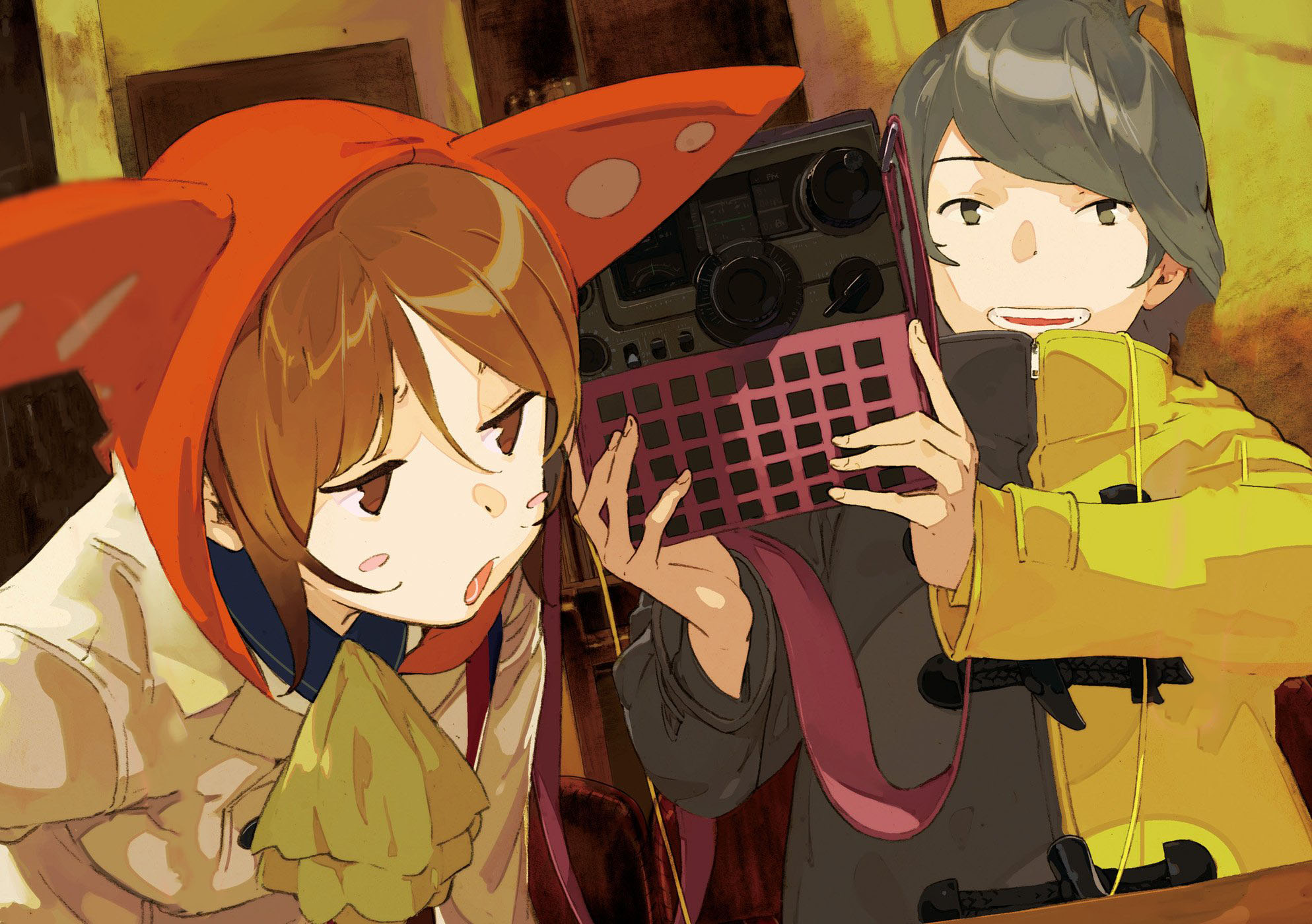Description: Two people standing next to each other holding a radio in their hands and looking at the screen with a smile on their face.