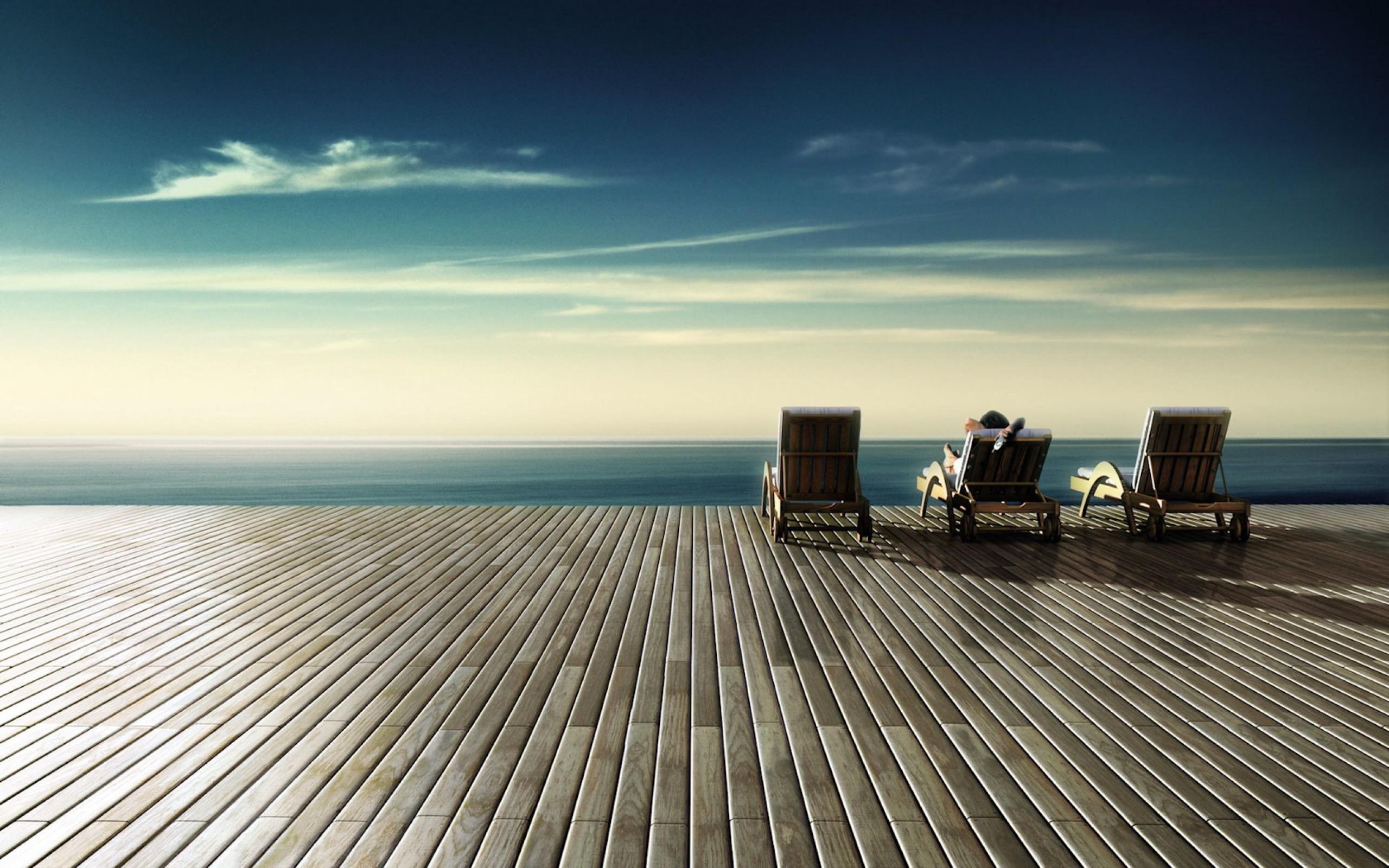 Description: Two people sitting on chairs on a deck overlooking the ocean and the ocean water.