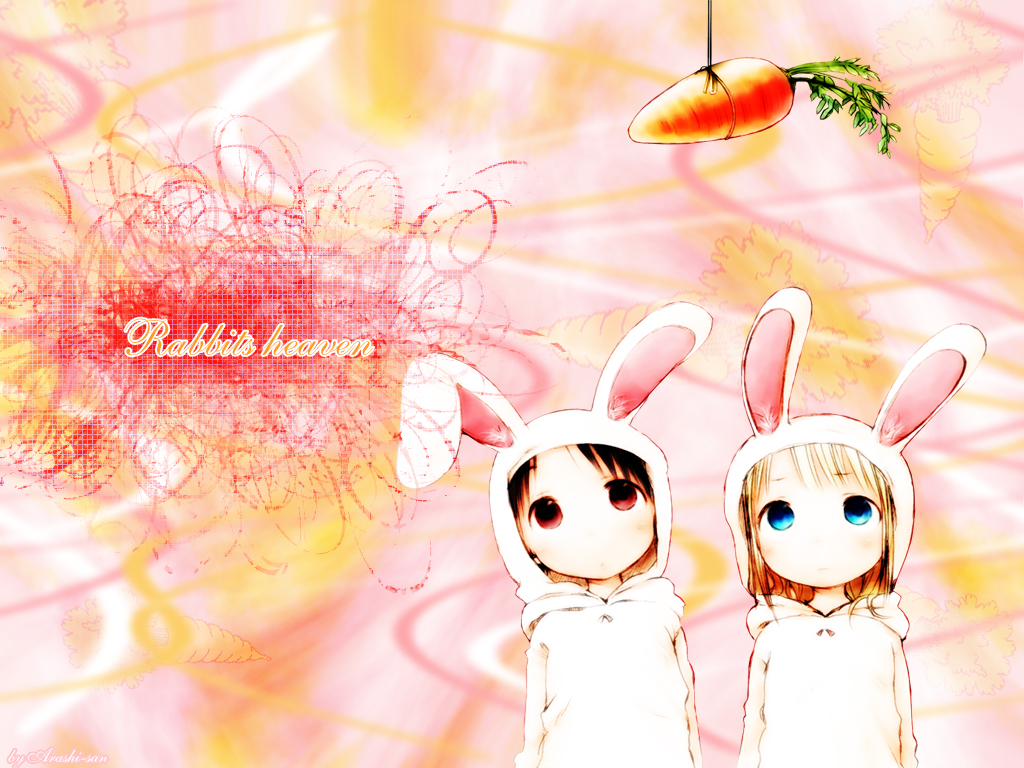 Description: Two rabbits are standing next to each other with carrots hanging from the ceiling above them.