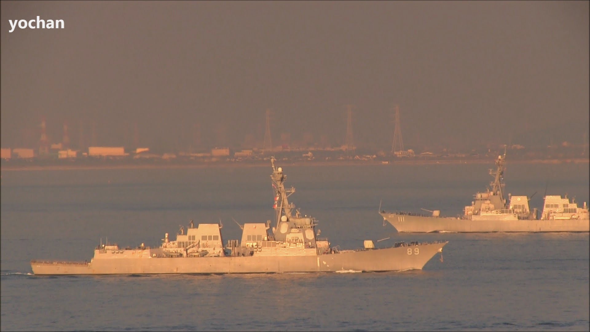 Description: Two ships in the water near each other in the ocean with a city in the background and fog in the sky.