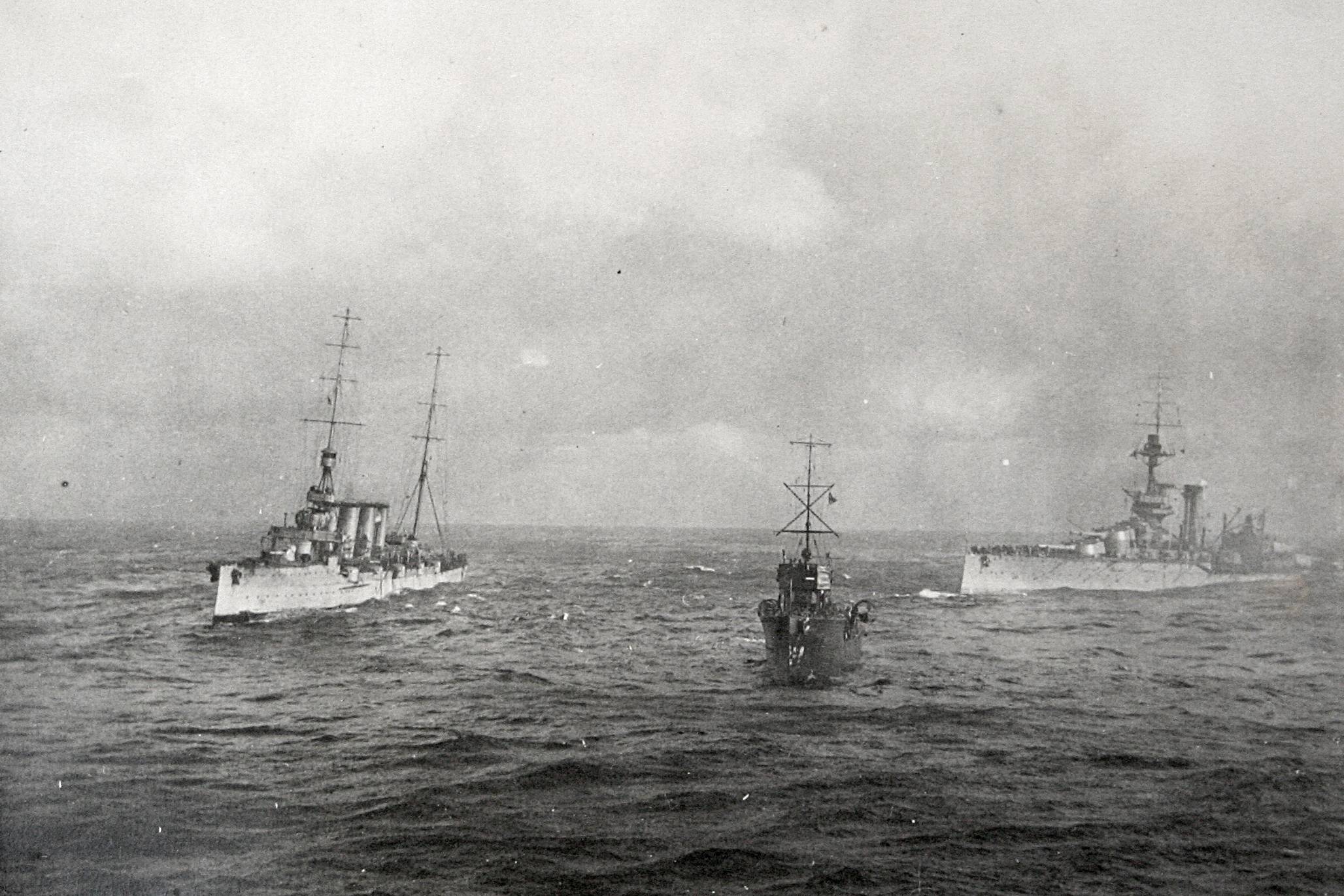 Description: Two ships in the water near each other in the ocean with a cloudy sky above them and a few smaller ships in the water.