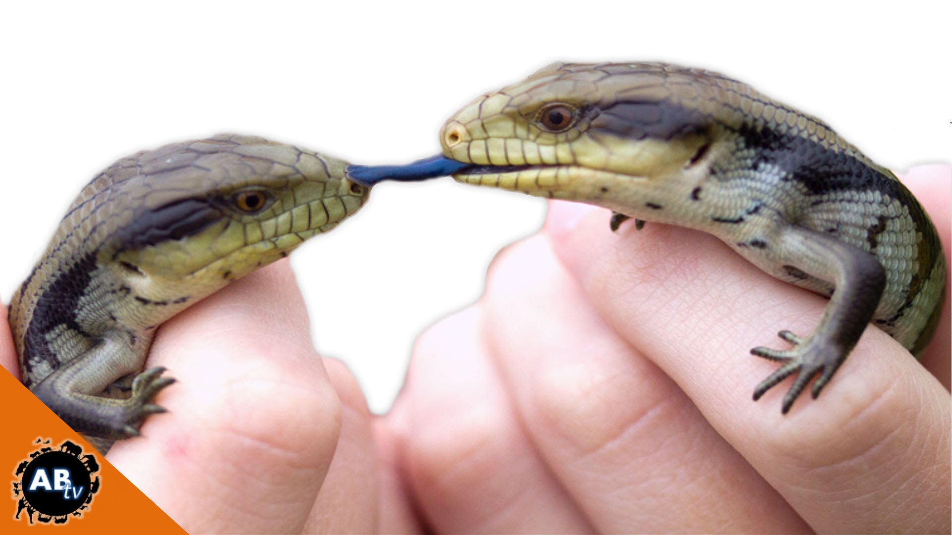 Description: Two small lizards are being held in their hands with a blue stick in their mouth and a white background.