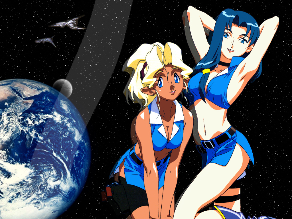 Description: Two women in blue outfits standing next to a planet and a spaceship in the background with a plane flying overhead.