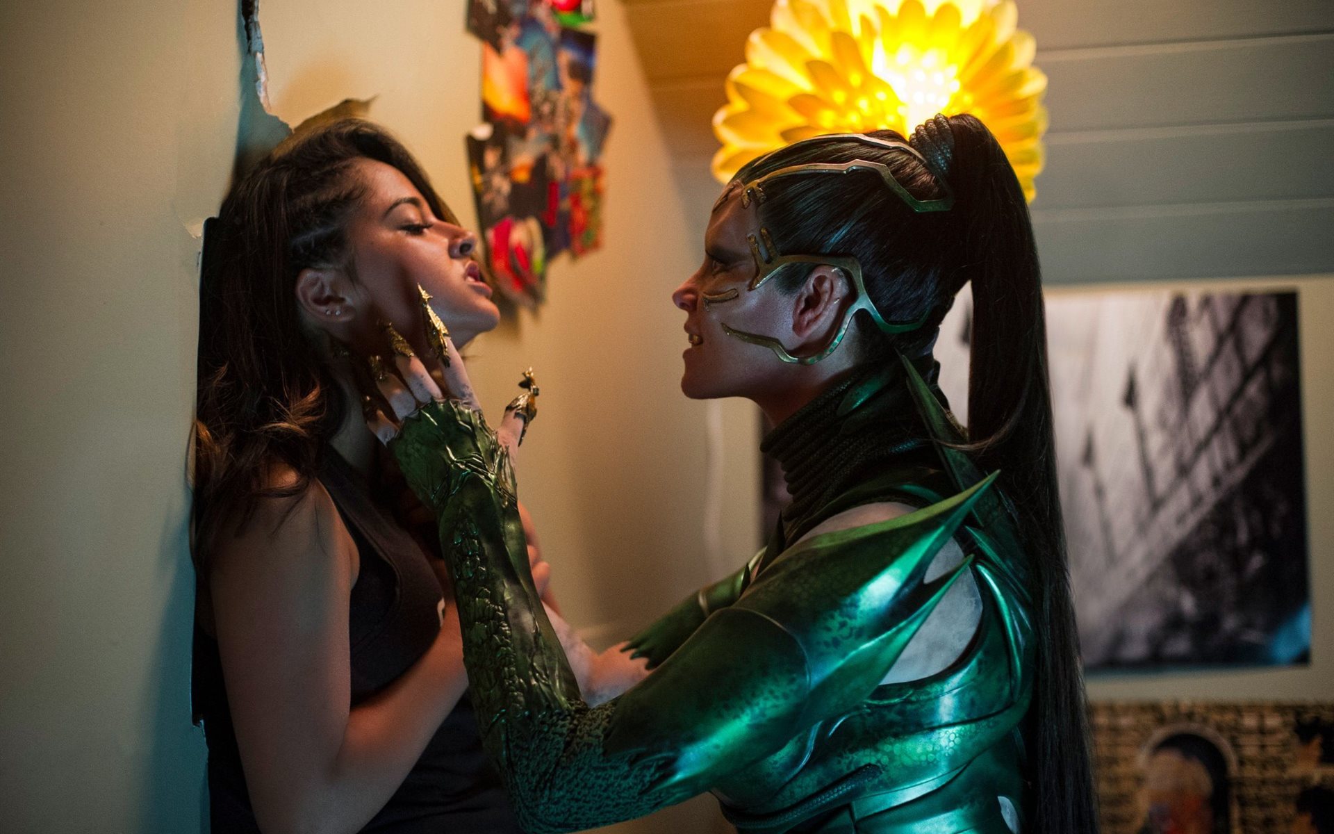 Description: Two women dressed in costumes are standing next to each other and one is touching the other's face.