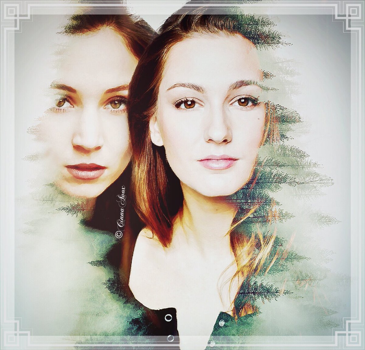 Description: Two women are posing for a picture together in a picture frame with a background of trees and a border.