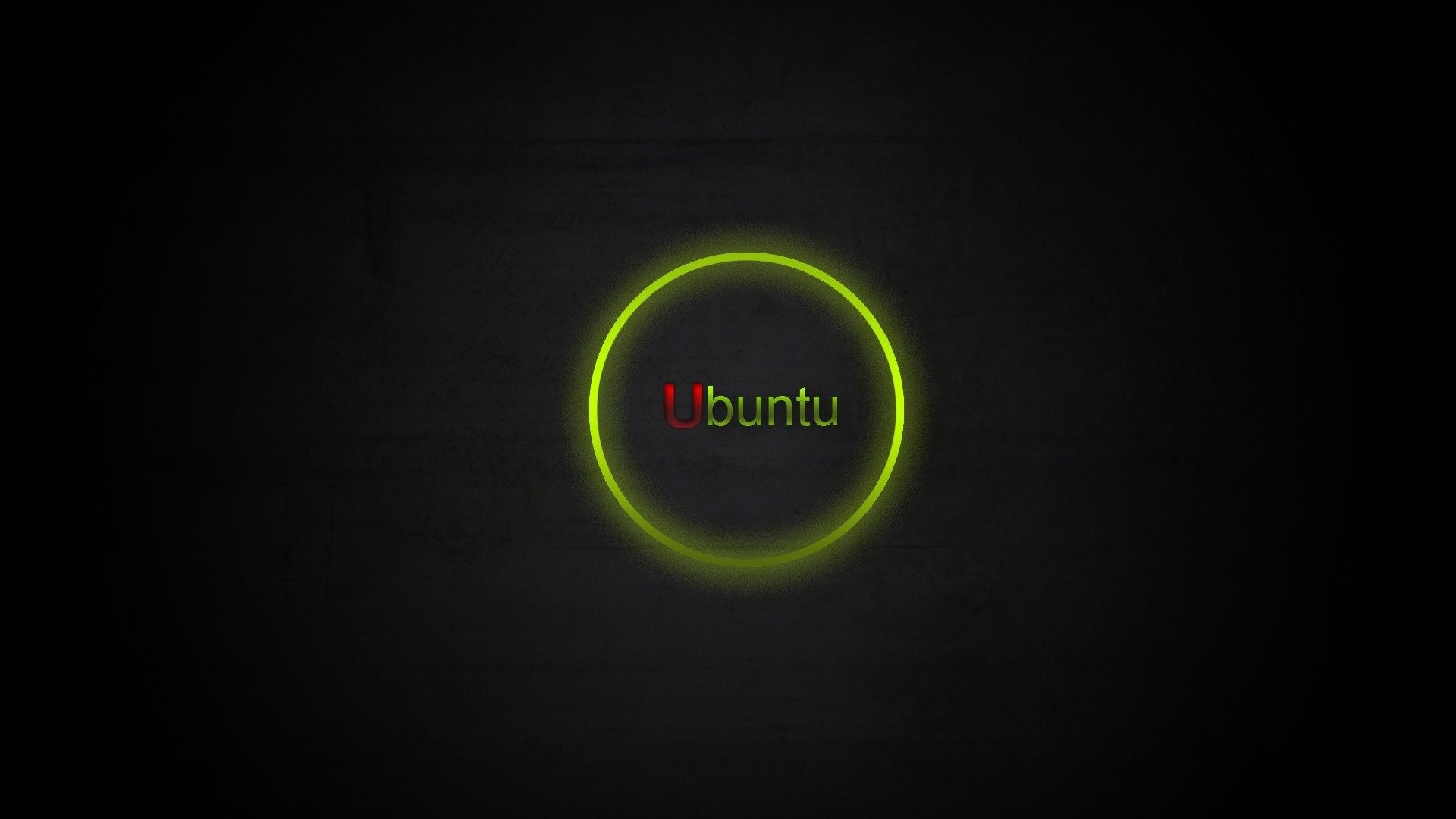 Description: A neon sign that reads ubuntu in a dark room with a black background and a green circle.
