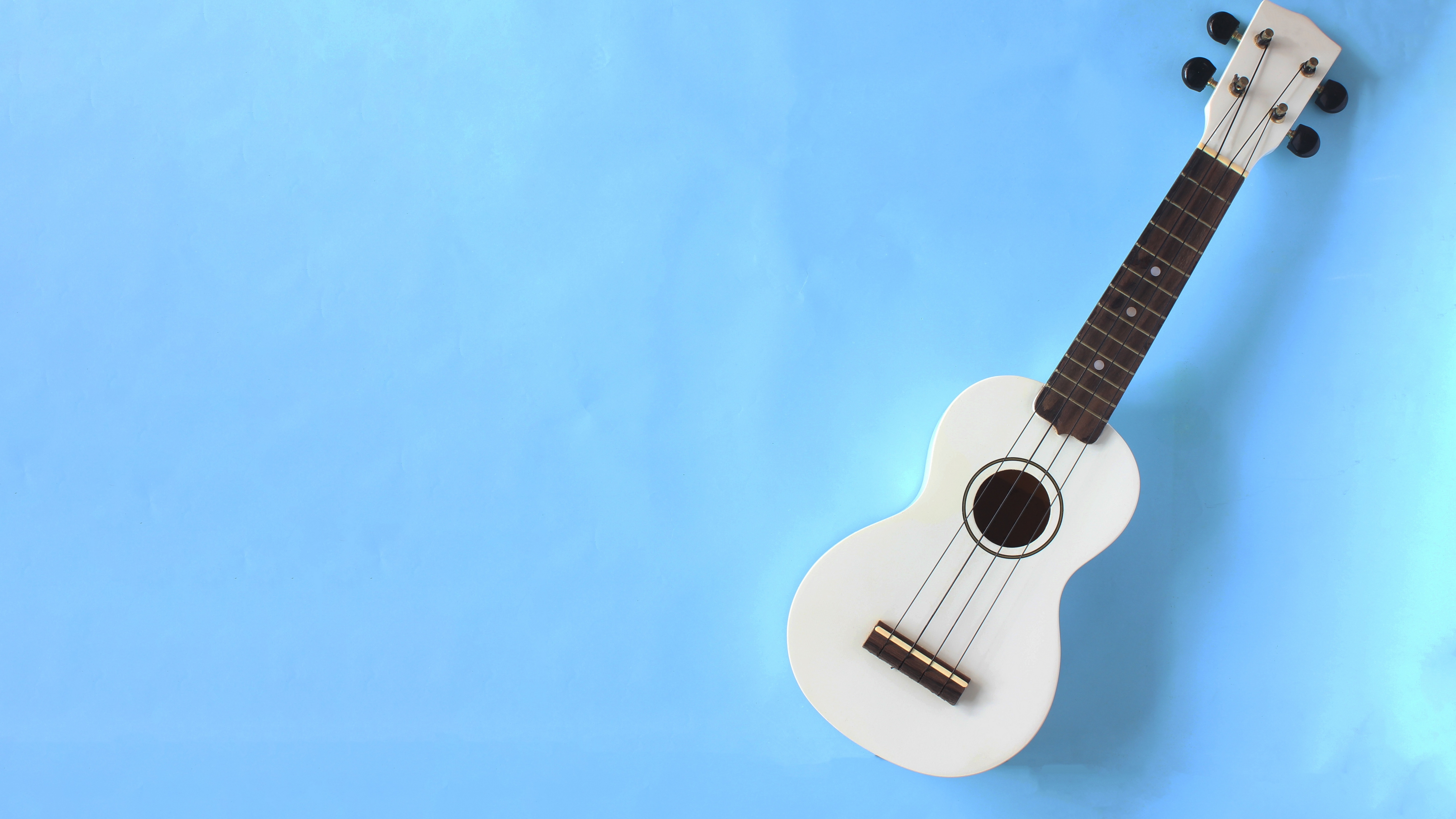 Description: A ukulele on a blue background with a white fretboard and strings missing the fret.