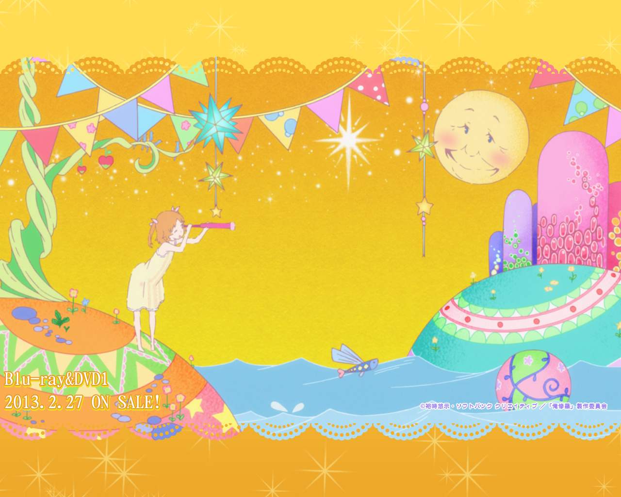 Description: A cartoon of a unicorn on a cake with a sky background and stars and a moon above it and a banner with a unicorn on top.