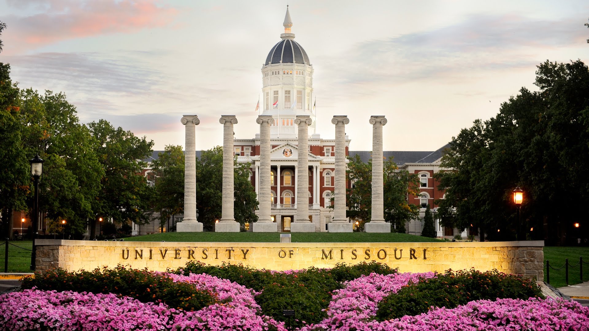 Description: A building with a dome and a clock tower in the background with flowers in the foreground and a sign that says university of missouri.