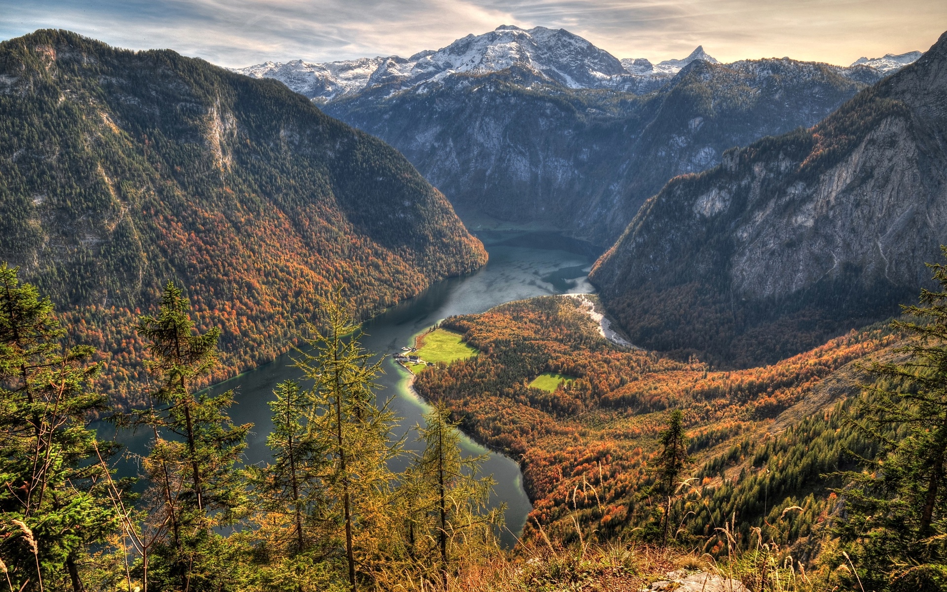 Description: A view of a valley with a lake surrounded by mountains and trees in the foreground.