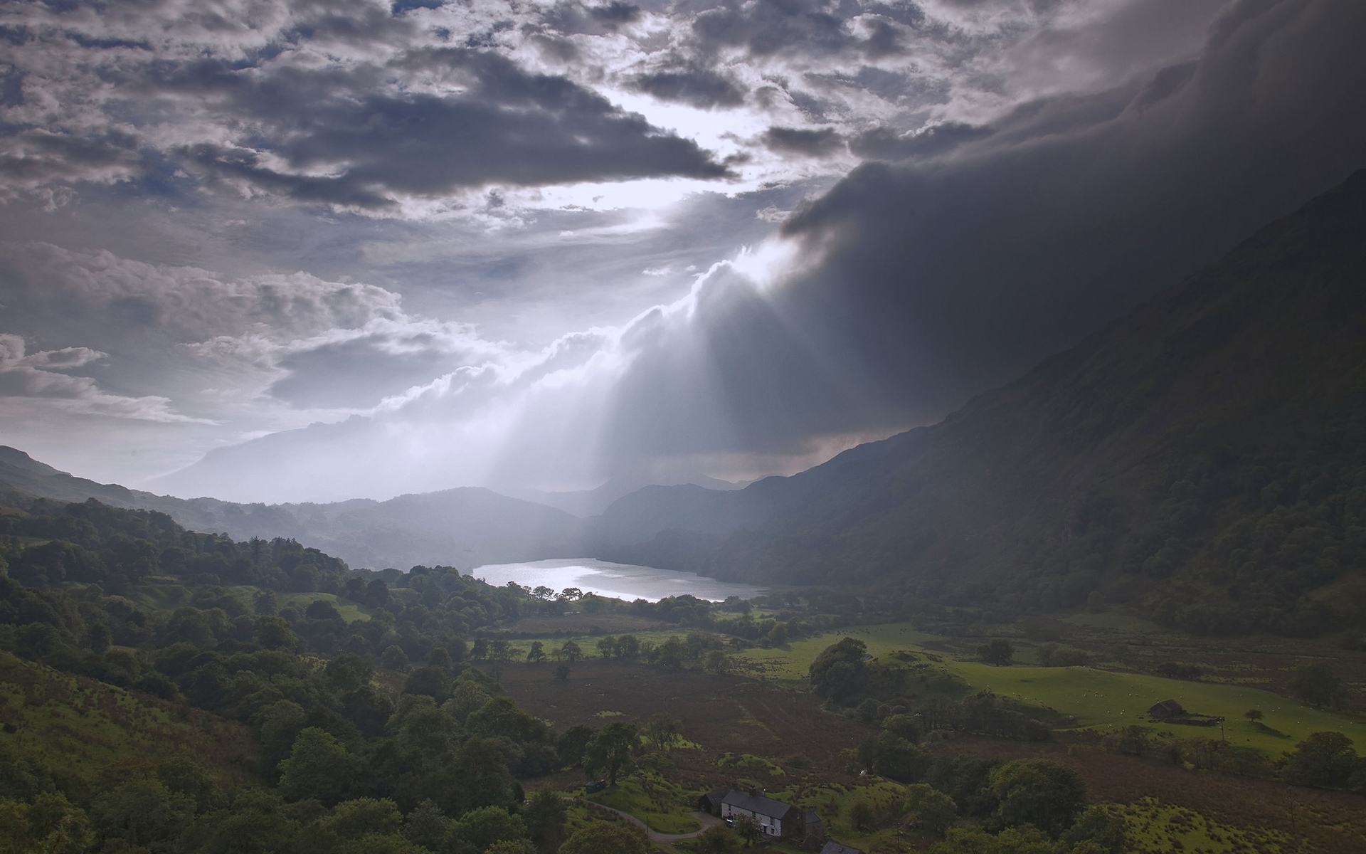 Description: A view of a valley with a lake and mountains in the background with sun rays coming through the clouds.