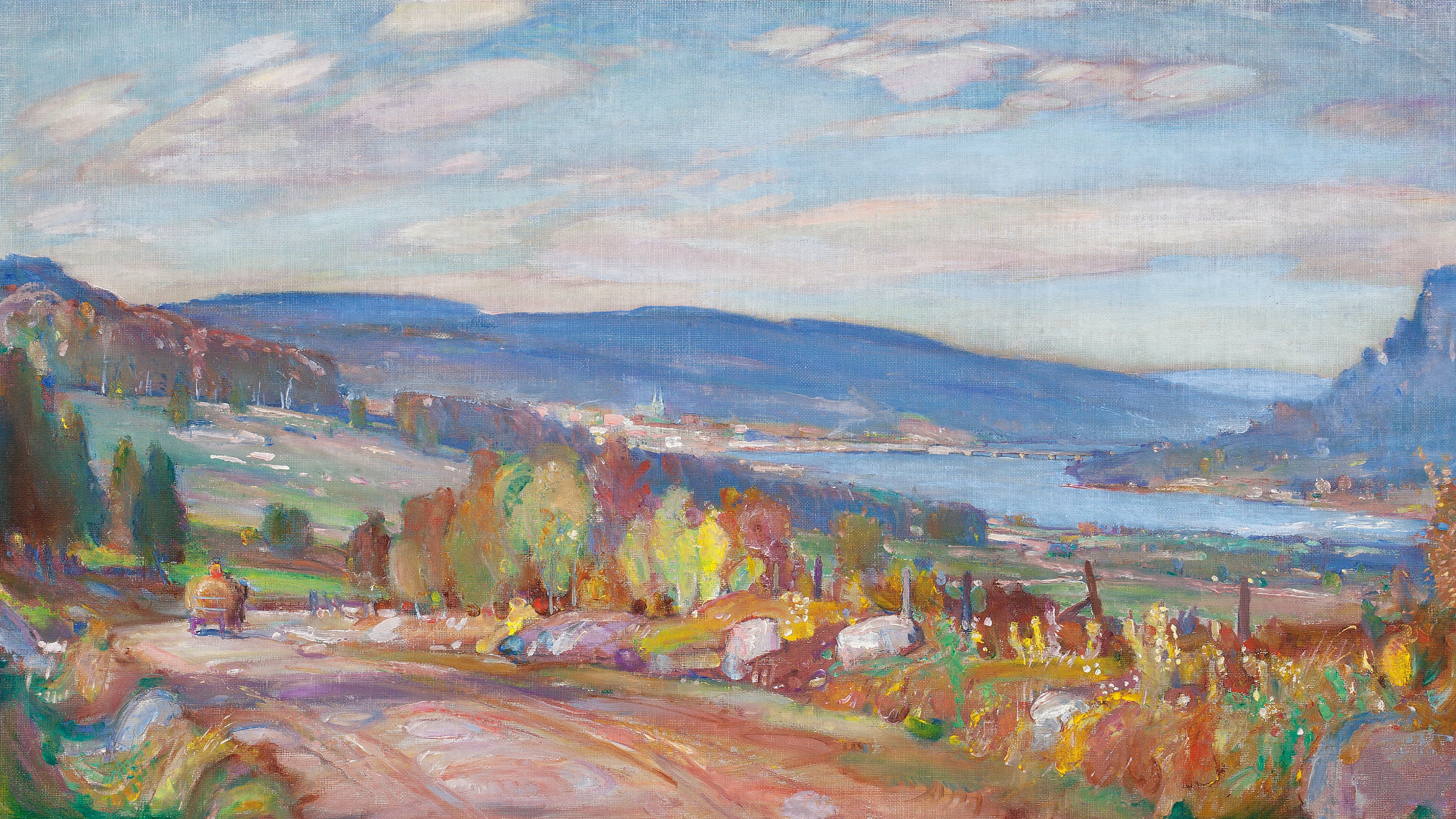 Description: A painting of a road going through a valley with mountains in the background and a body of water in the distance.