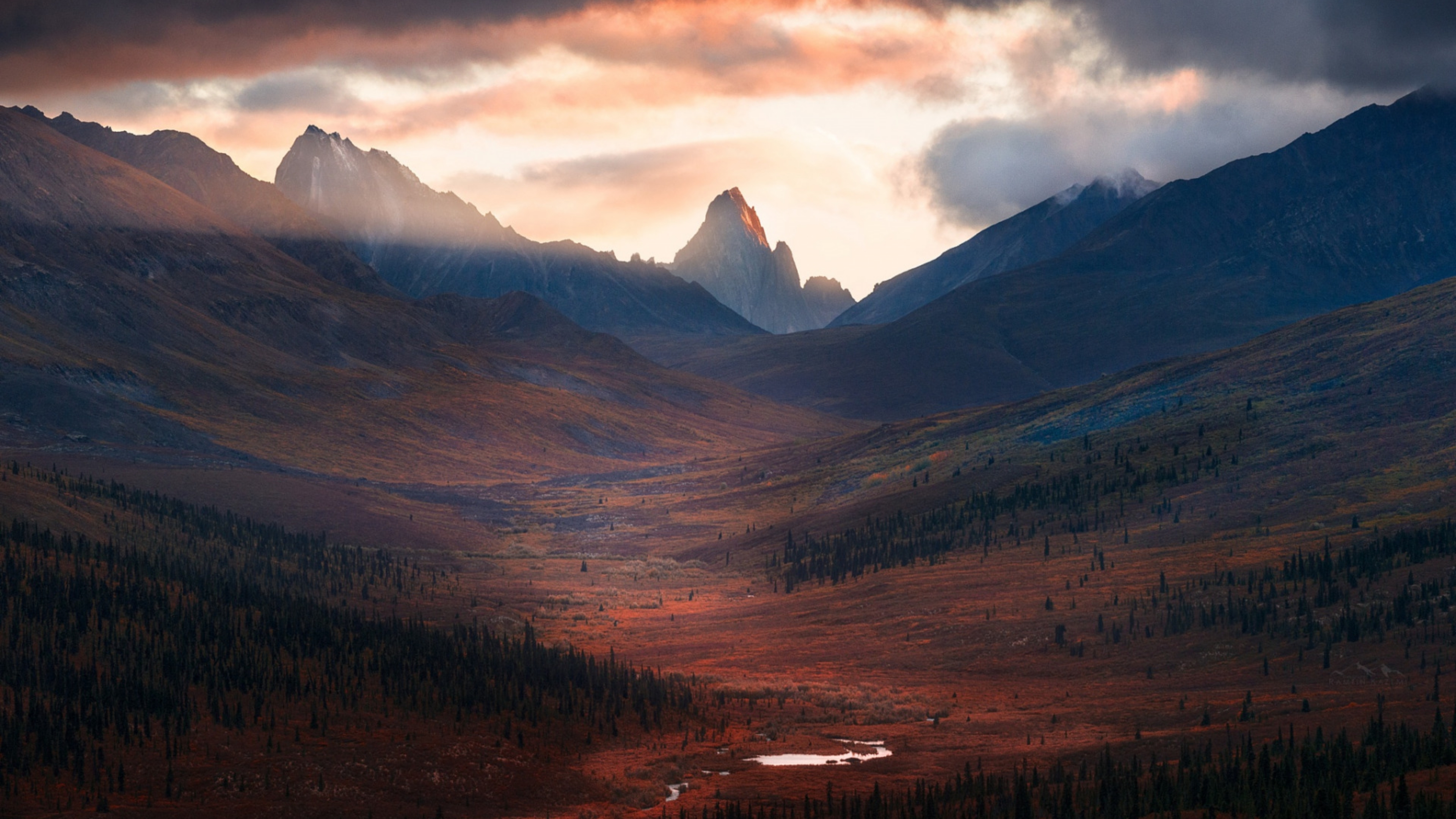 Description: A valley with a river in the middle of it and mountains in the background with clouds in the sky.