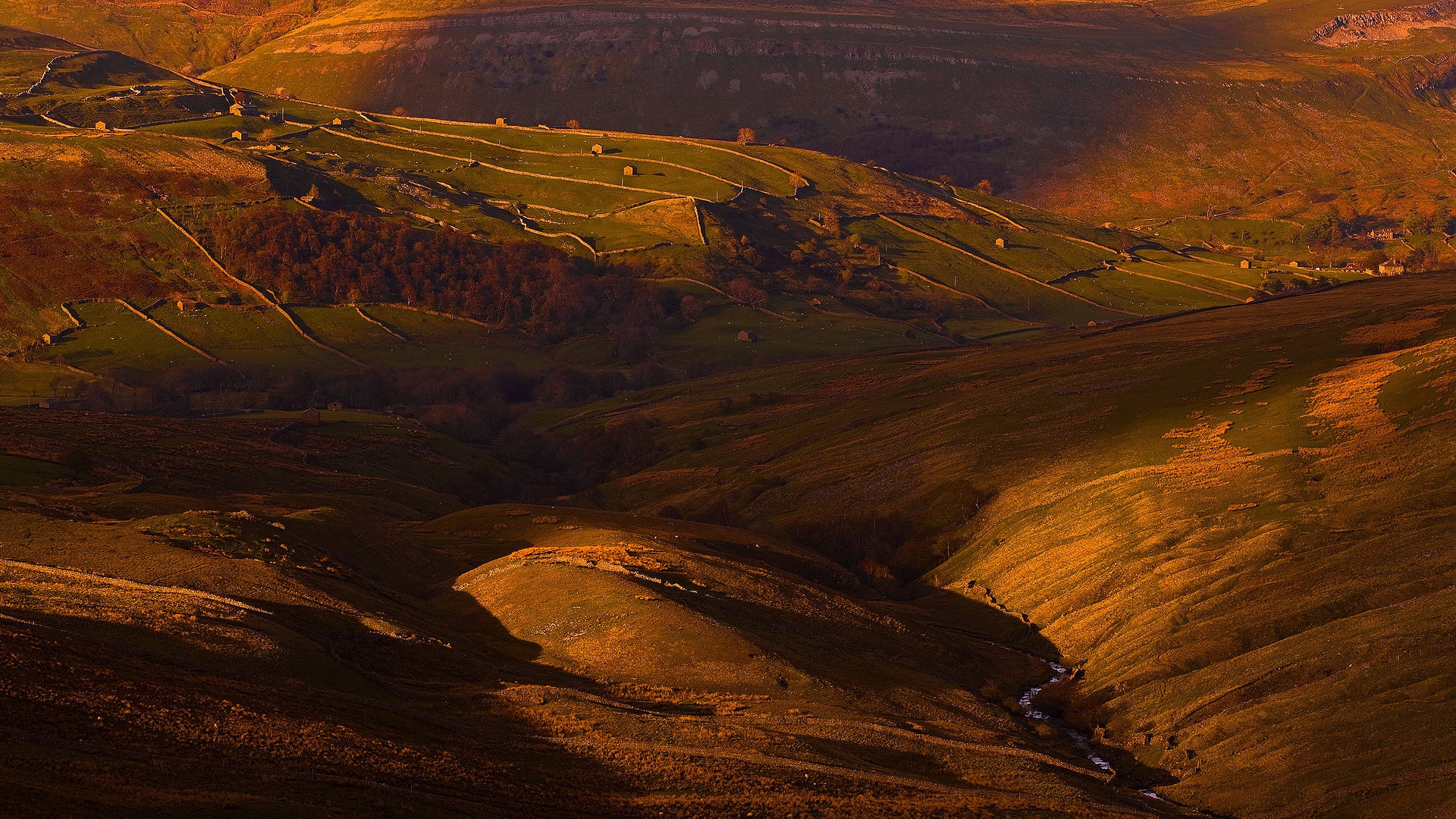 Description: A valley with a stream running through it and a hillside in the background with a few trees on the hillside.