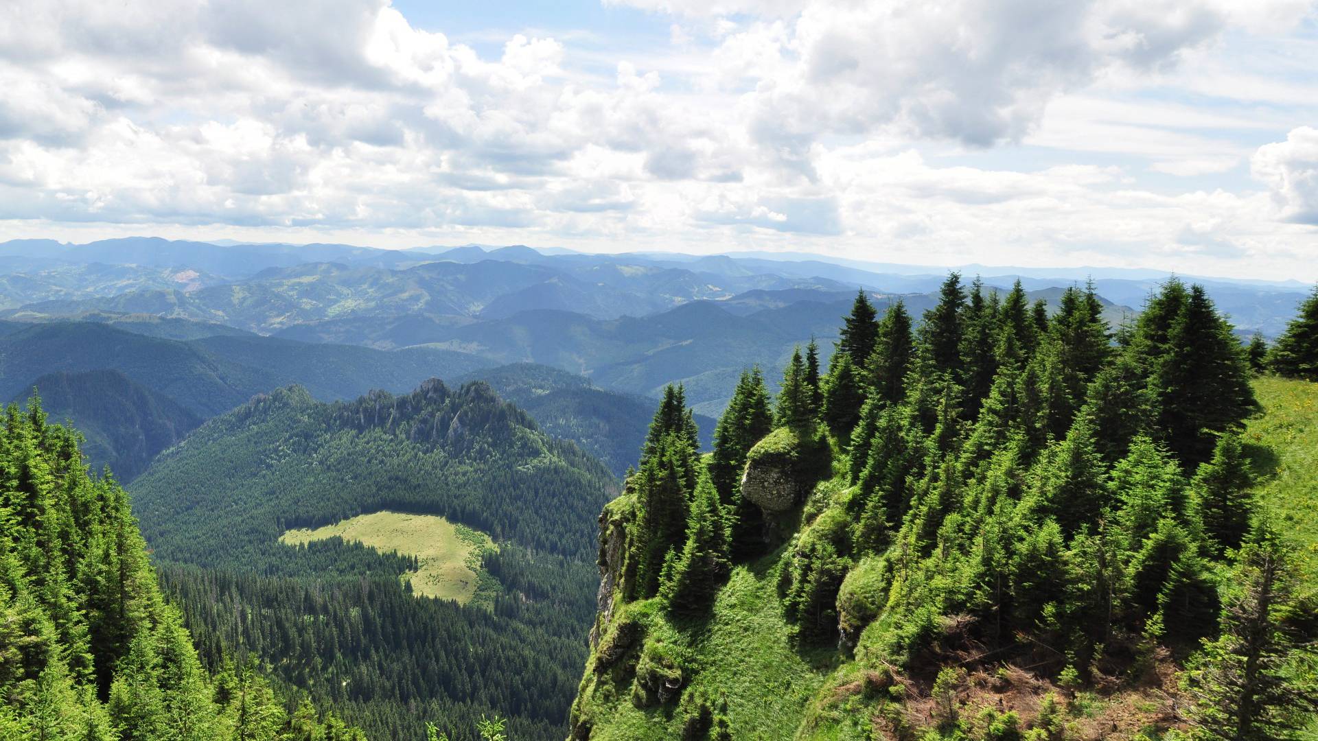 Description: A view of a valley with a lot of trees in the foreground and mountains in the background with clouds in the sky.