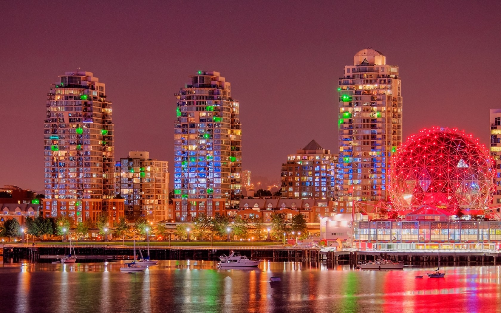 Description: A city skyline with a ferris wheel lit up at night with a colorful light show in the background and a boat in the water.