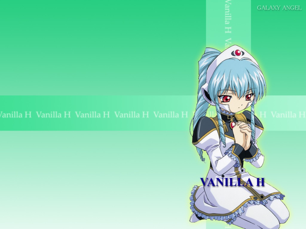 Description: A anime character with blue hair and a white dress and a green background with the name vanilah.