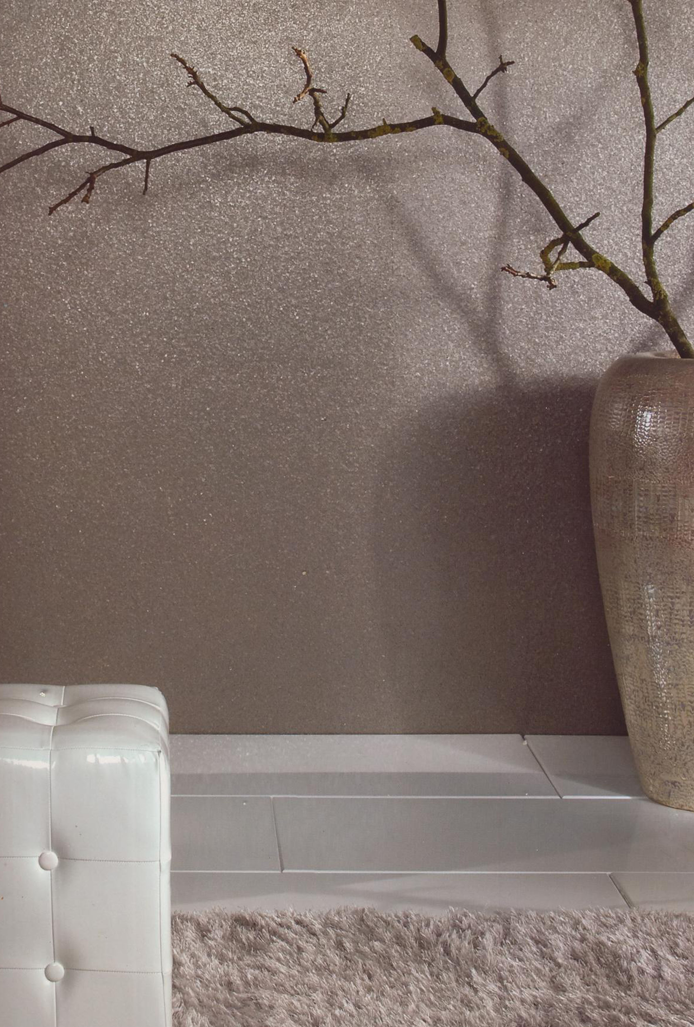 Description: A vase with a branch in it sitting on a shelf next to a bench and a wall with a wallpaper.