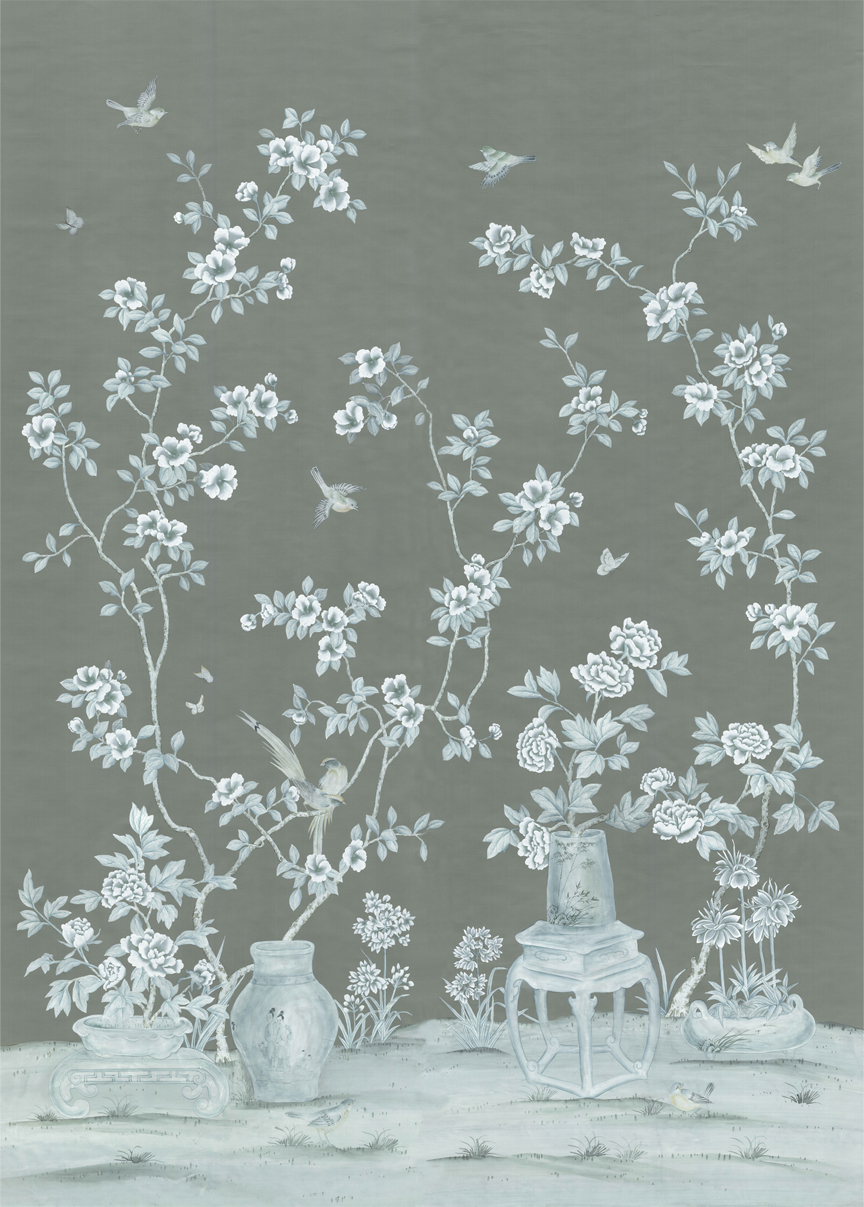 Description: A drawing of a vase with flowers and birds on it and a bird flying over it and a bird on a table.